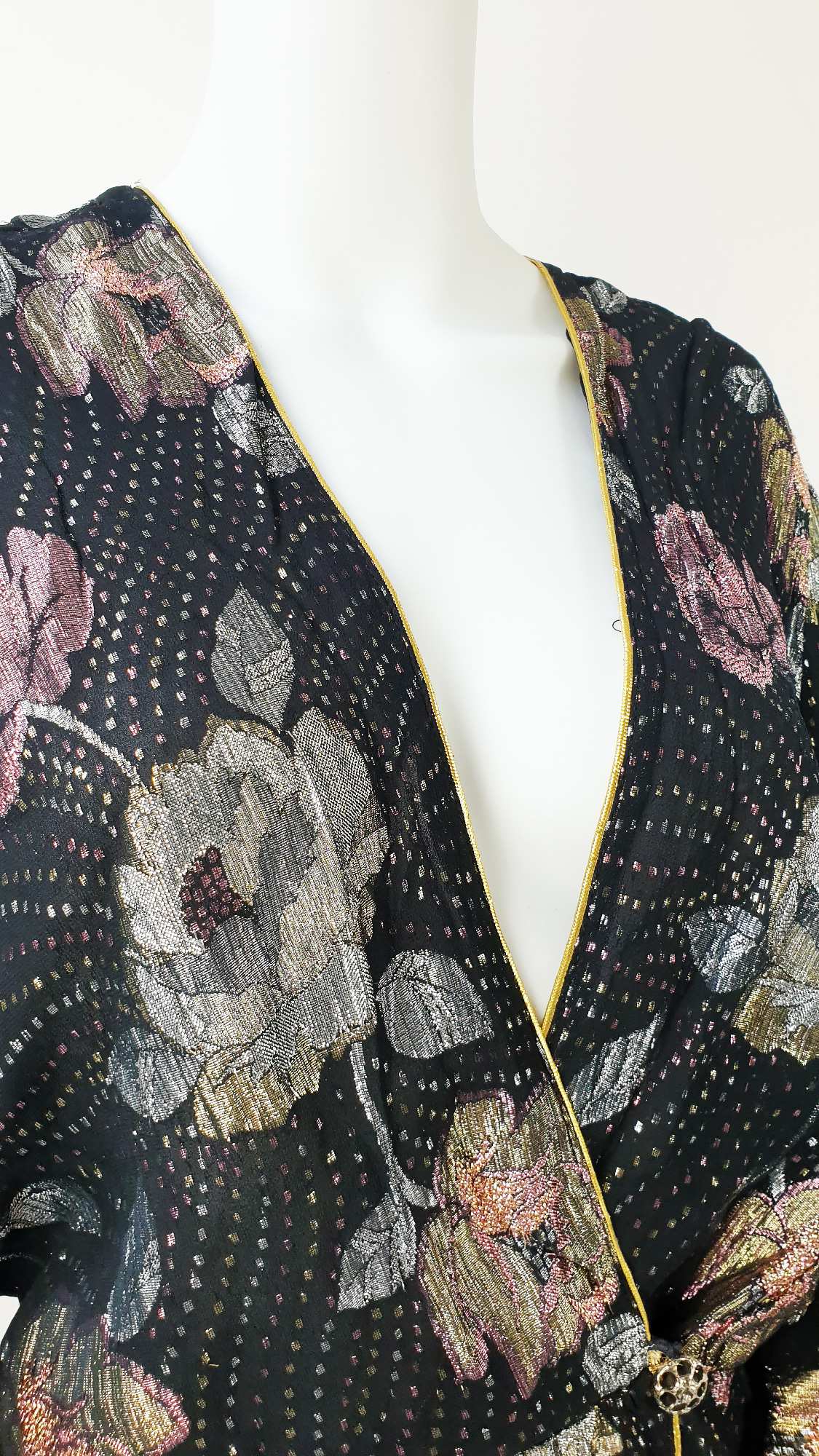Cardigan con stampa a fiori lamè, con orlo dorato, chiusura con doppio bottone di metallo e maniche a tre quarti con bottone. Taglia mancante, la taglia è stimata dai nostri esperti.