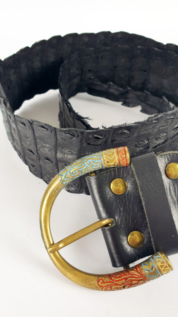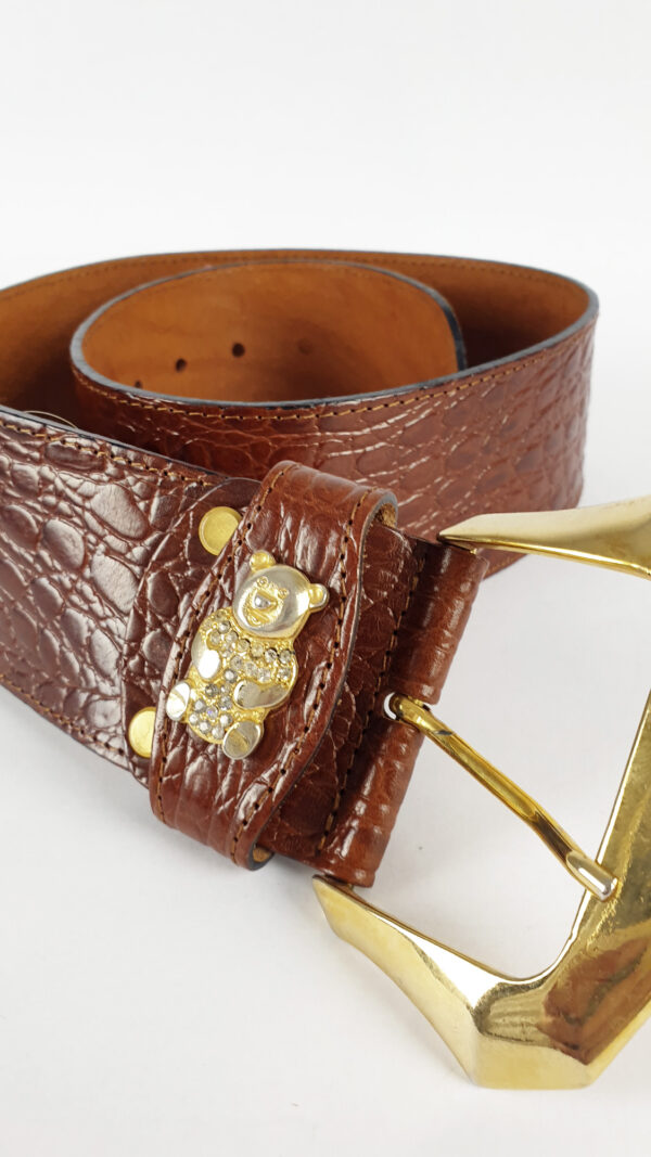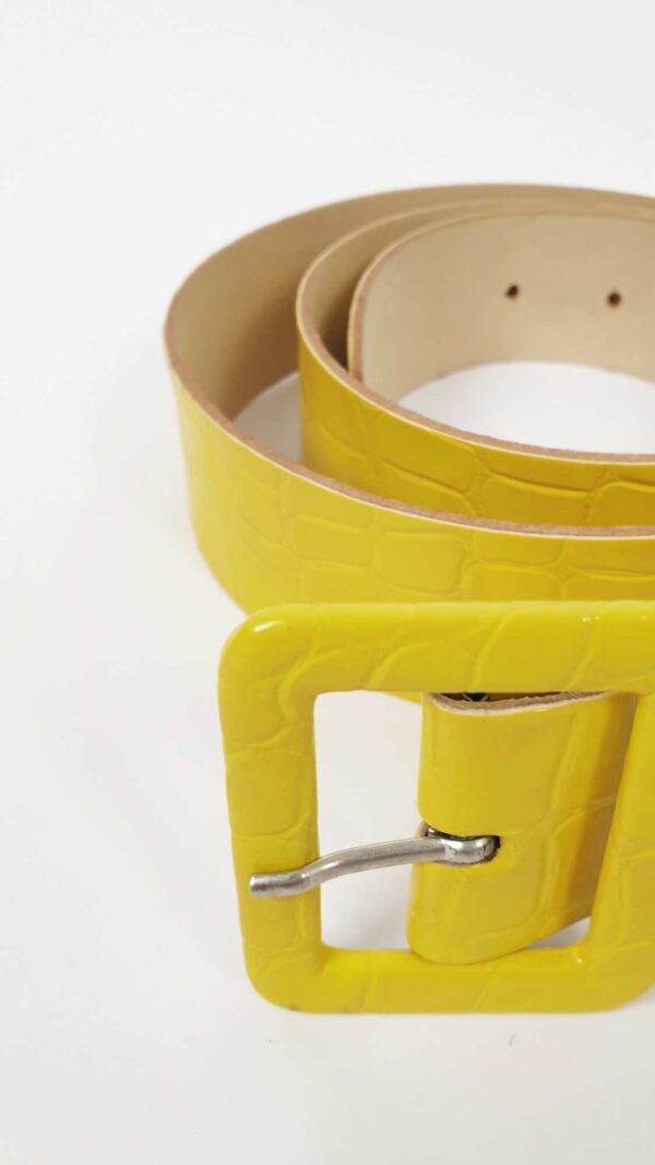 Cintura vita alta in pelle con impunture a contrasto. Chiusura con cinturino con fibbia di metallo dorato.
